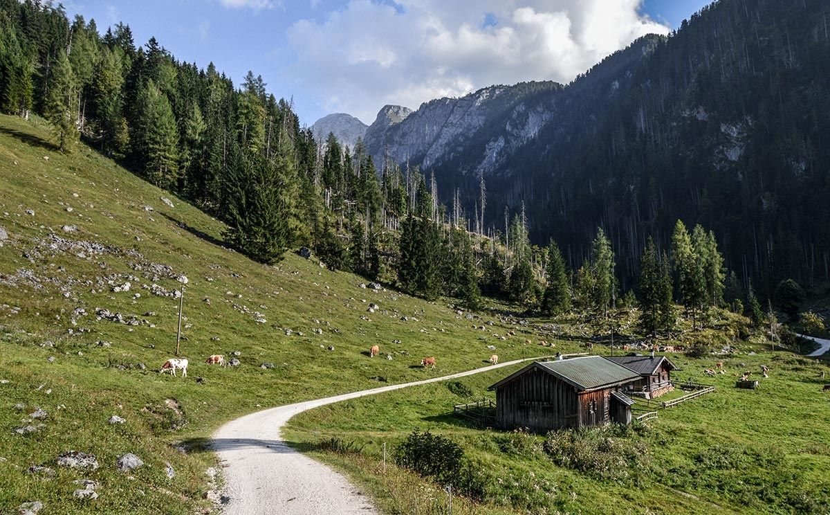 Wir folgen der Beschilderung nach links über die Ramsauer Ache nach Königssee auf die Königsseer Straße. Von dieser biegen wir nach links ab in die Vorderbrandstraße in Richtung Faselsberg. Hier finden wir auch ein rotes Schild mit weißer Schrift für unsere Route, die Mountainbikestrecke Nr. 9. Wir fahren nun auf der streckenweise sehr steil ansteigenden Fahrstraße über Mitterbach nach Vorderbrand. Dort lädt uns der gleichnamige Gasthof zu einer ersten Rast ein. Nun fahren wir weiter auf der Fahrstraße bis zum Parkplatz Hinterbrand. Dieser ist ein alternativer Startpunkt für unsere Tour: Wer von hier aus losfährt, spart sich die ersten 500 Höhenmeter.