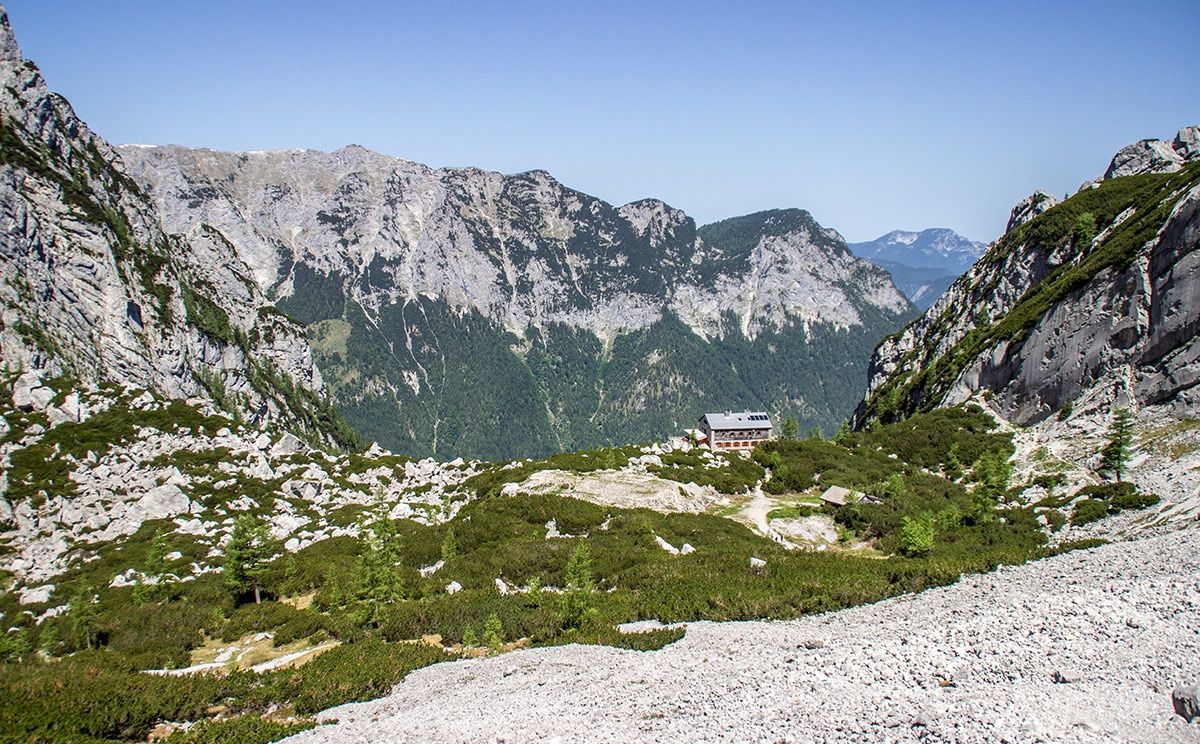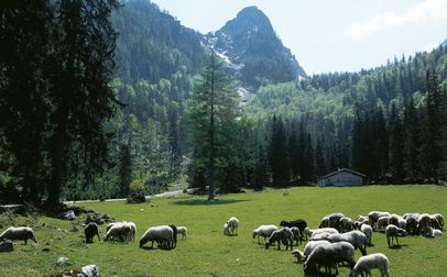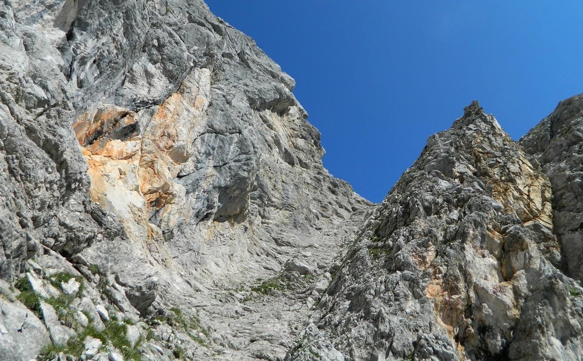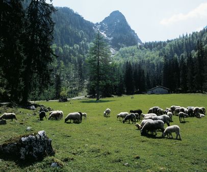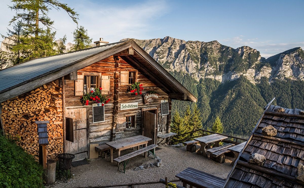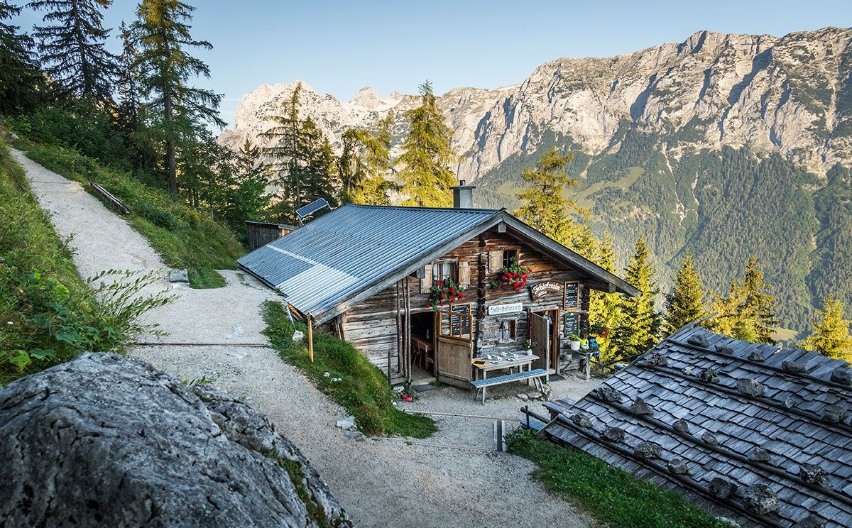 Startpunkt der Tour ist die Pfeiffenmacherbrücke in Ramsau. Über die Forststraße, die im Winter als Rodelbahn fungiert, führt der Weg bis zur Eckaualm. Hier mündet der breite Weg in einen schmaleren Pfad, der in Serpentinen durch den Wald weiter nach oben führt. Kurz nach der Hochalm Diensthütte zweigt sich der Weg: Nach links zur Hochalmscharte, über die man ins Wimbachgries absteigen kann und nach rechts zur Eisbodenscharte. Über Felsbrocken führt der mit Punkten markierte Weg an den letzten Schneefeldern vorbei bis ganz an die Felswand.Nach einer kleinen Sandreißen steht man schließlich unterhalb der Eisbodenscharte. Durch die mit Stahlseilen versicherte Rinne klettert man nach oben. Nach wenigen Minuten einfacher Kletterei hat man erstmals einen Tiefblick zum Hintersee. Die letzten Meter von der Eisbodenscharte zum Gipfel der Schärtenspitze auf 2.153 Metern Höhe führen genau an dem Grat entlang, den man von der Hochalm aus immer sieht. Die ausgesetzten Stellen sind auch hier mit einem Drahtseil gesichert; die Wand zur Hochalm fällt fast senkrecht ab. Am Gipfel angekommen hat man einen wunderbaren Ausblick auf das Hochkaltermassiv, die Westflanke des Watzmanns und die Reiter Alpe. Der Abstieg führt über den Normalweg zur Blaueishütte.