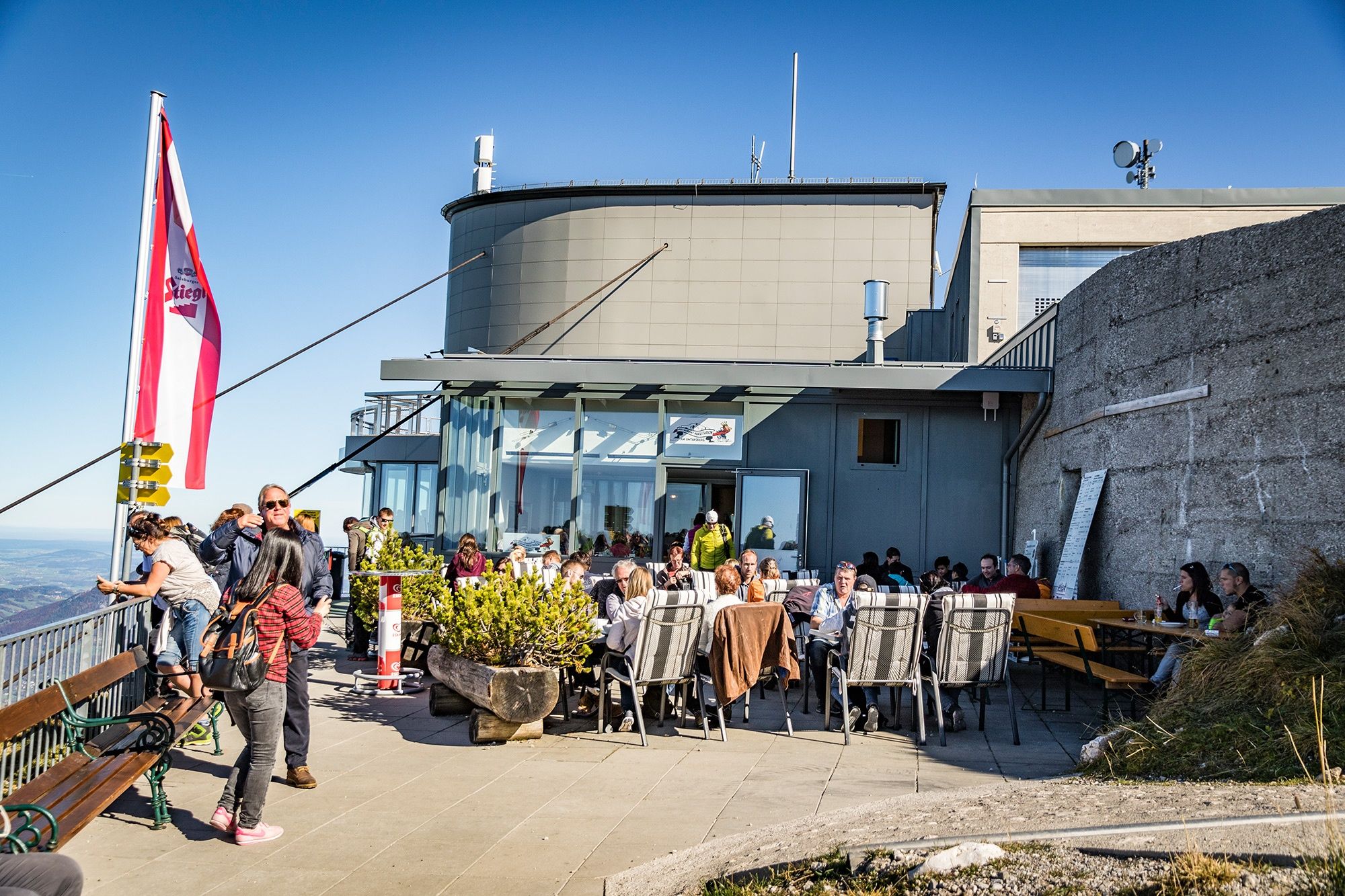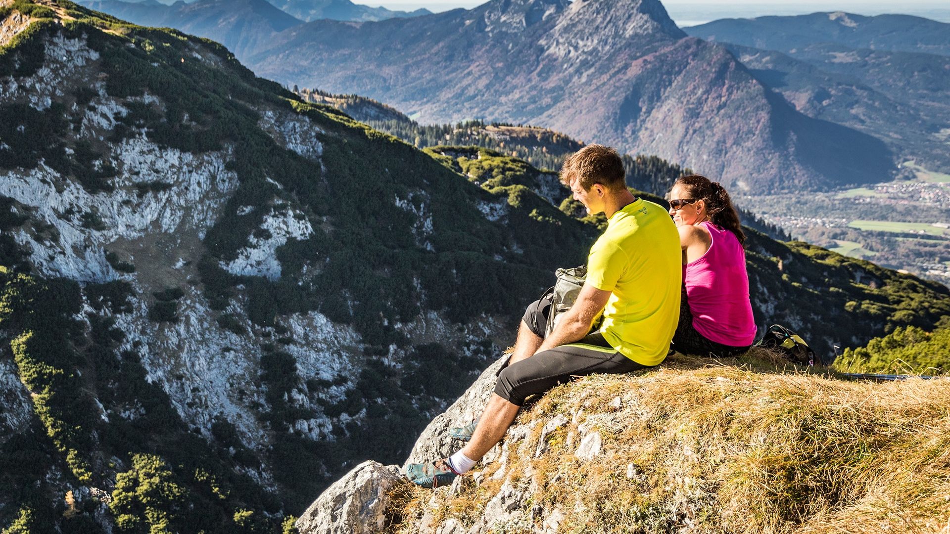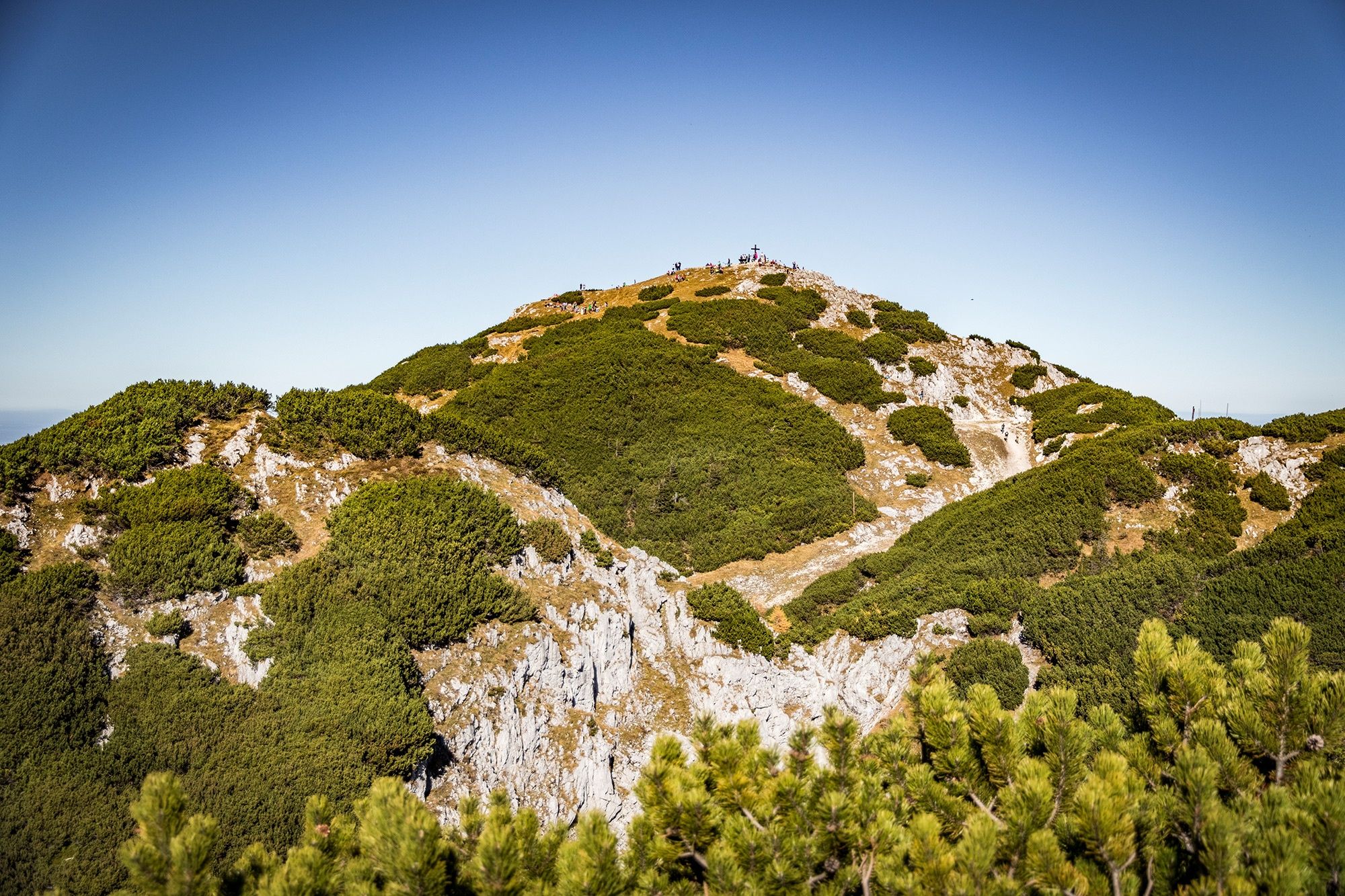 Nun haben wir bereits eine Höhe von 1.411 m erreicht und das Gelände ist deutlich felsiger. An der Hütte folgen wir dem Weg nach links, wobei wir die sehenswerte Schellenberger Eishöhle passieren, und umrunden im Uhrzeigersinn die Spitze des Wandkopfes. Ab hier führt unser Weg stets auf der deutsch-österreichischen Grenze entlang. Nacheinander besteigen wir die Gipfel Großer Heubergkopf, Salzburger Hochthron und Geiereck - alle über 1.800 m hoch. Auf dem Geiereck befindet sich die Bergstation der Untersbergseilbahn, mit der wir zurück ins Tal fahren.