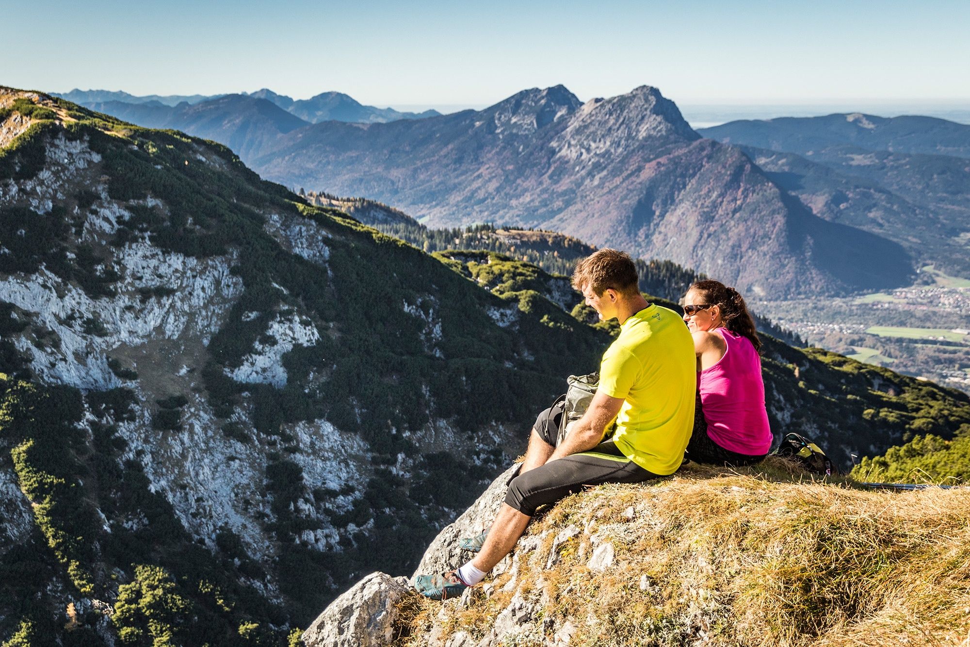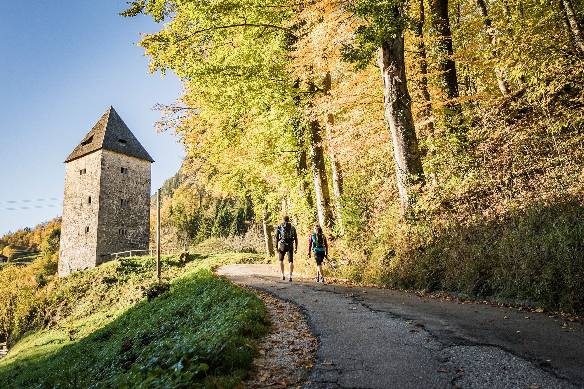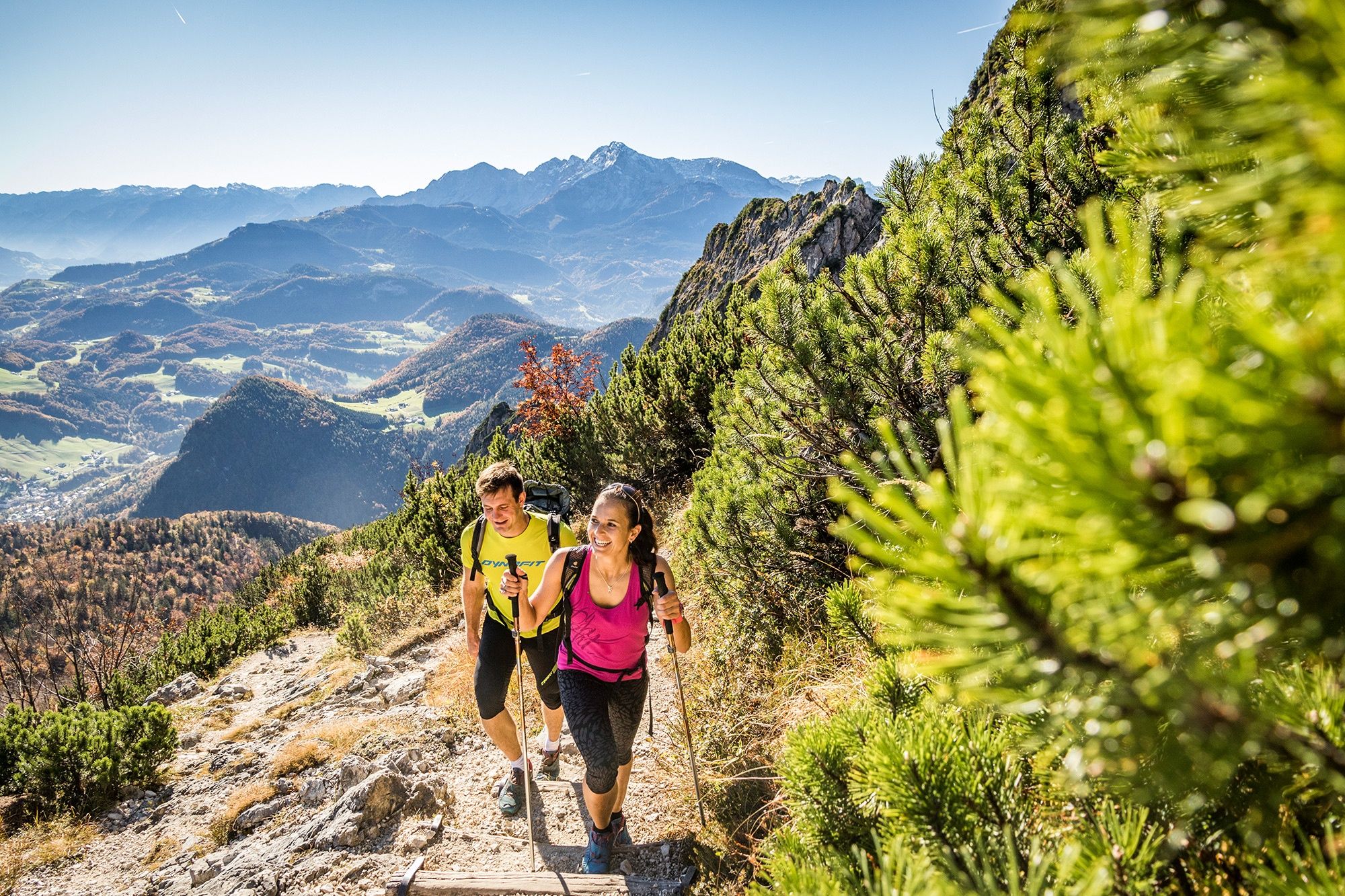 Nun haben wir bereits eine Höhe von 1.411 m erreicht und das Gelände ist deutlich felsiger. An der Hütte folgen wir dem Weg nach links, wobei wir die sehenswerte Schellenberger Eishöhle passieren, und umrunden im Uhrzeigersinn die Spitze des Wandkopfes. Ab hier führt unser Weg stets auf der deutsch-österreichischen Grenze entlang. Nacheinander besteigen wir die Gipfel Großer Heubergkopf, Salzburger Hochthron und Geiereck - alle über 1.800 m hoch. Auf dem Geiereck befindet sich die Bergstation der Untersbergseilbahn, mit der wir zurück ins Tal fahren.