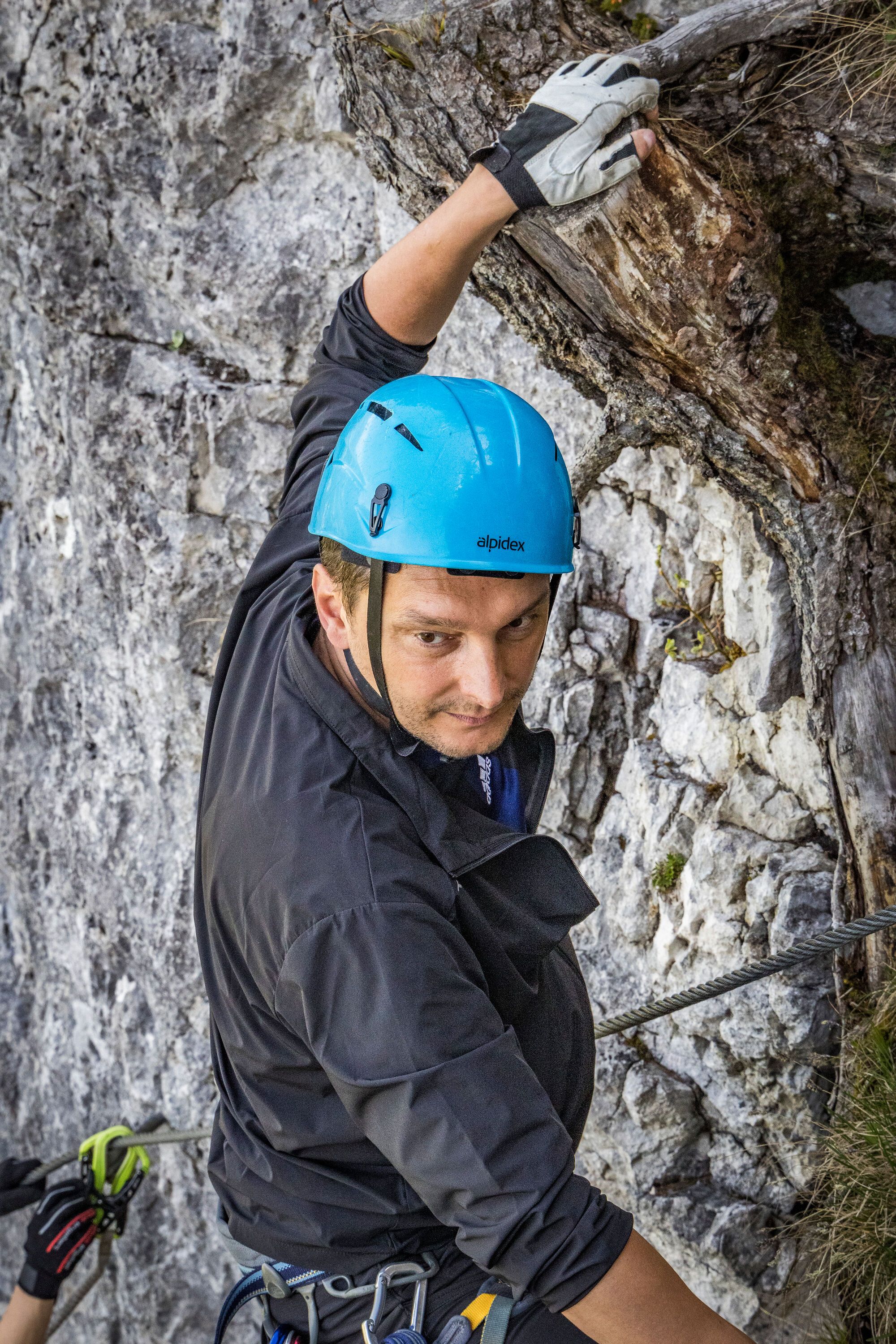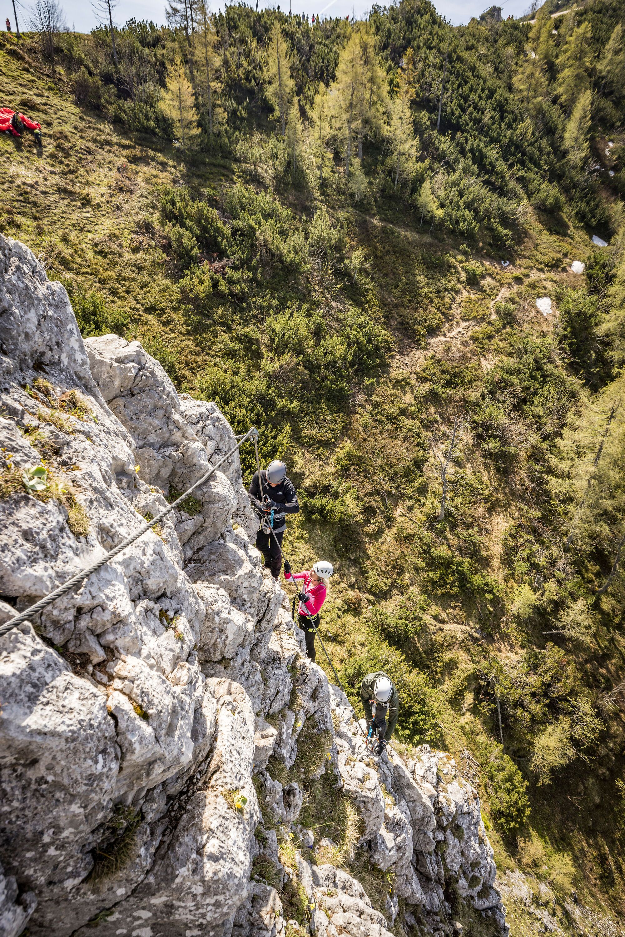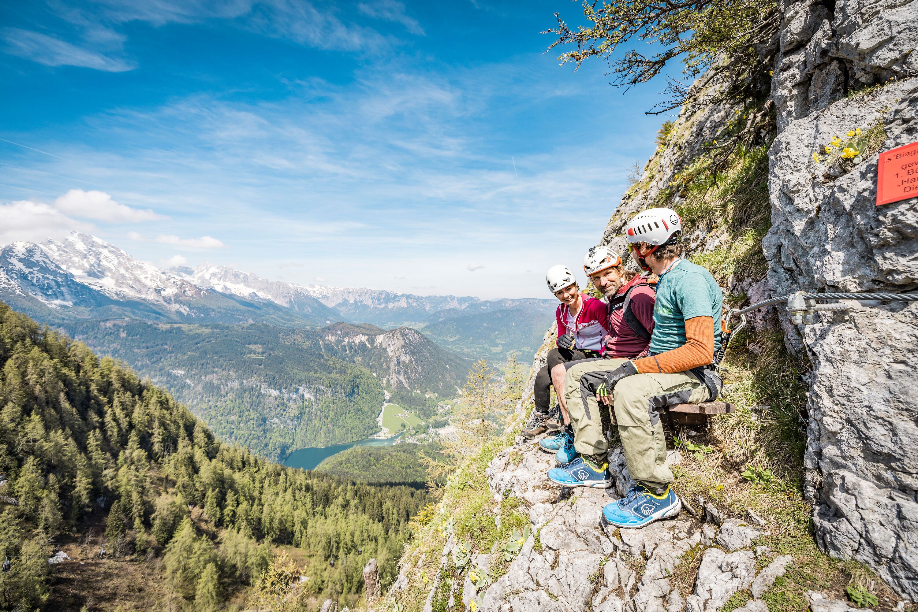 - Die angenehmste Zustiegsmöglichkeit beginnt an der Bergstation der Jenner-Bergbahn (1802 m, Auffahrt mit der Seilbahn von Königssee). Auf breit ausgebauten Weg linkshaltend über den Jennergrat zum Startplatz der Gleitschirmflieger, 1675 m, oberhalb des Kleinen Jenners (20 Min.) absteigen. Nach links zu einem kleinen Sattel am Fuß des Gipfelaufbaus des Kleinen Jenners hinab (Rastbank und Infotafel Klettersteig). Hier nach Norden haltend auf schmalem Waldsteig durch den lichten Wald zum Einstieg absteigen. Nach ca. 200 Metern wird der Notausstieg erreicht, hier kann bereits für eine kürzere Variante des Klettersteigs eingestiegen werden. Nach weiteren 100 m in nördl. Richtung wird der eigentliche Einstieg erreicht (30 Min.).