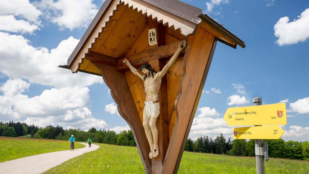vom Haus des Gastes Neukirchen nach Süden zur Staatsstraße dann nach rechts unter Autobahn durch und gegenüber der Autobahnausfahrt links den Schwarzenbergweg hinauf; der Teerstraße folgend in einer Linksschleife zum alten Wasserbehälter am Waldrand; weiter bergauf auf dem Fahrweg, vorbei an den hochgelegenen Einöden Schwarzenberg und Mitterstatt zum höchsten Punkt des Rundweges, dem Hochbehälter Feilnreit (von hier aus herrliche Aussicht auf den Chiemgau und Rupertiwinkel), nun auf dem Fahrweg hinunter zum Ort Mauerriedl (abseits unseres Weges in ca. 1 km das Gasthaus von Wald), am Ortsende rechts hinunter nach Thal und Obereck; dann weiter bergab und, vor einem kleinen Gehölz, rechts auf den Weg nach Plereit; hinauf zum Gehöft mit der großen Linde, dann halblinks bergab zur Weggabelung; dort rechts in den Wald zur kleinen Wegkreuzung "Teerstraße" (rechts der Kressenberg mit Stolleneingang und kleiner Kapelle (ehem. Pulverturm) aus der Zeit des Erzbergbaues - siehe Beschreibung nach Weg Nr. 33); nun geradeaus durch den Wald bis zur Kreisstraße unterhalb Weitwies; nun halbrechts weiter bis zur Kapelle; dort links und nach 100 m rechts den Pfad im Wald hinunter bis zur Einmündung des Waldweges in den Schwarzenberger Weg; von dort zurück zum Ausgangspunkt.