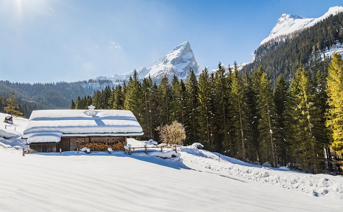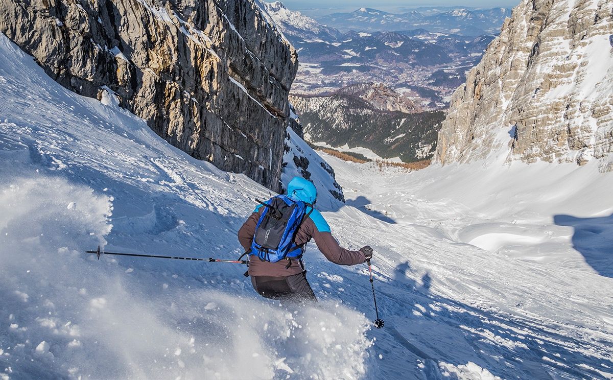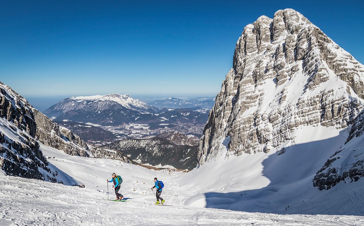 In der Benzinkurve verläßt man nun die breite Straße und steigt in Fall-Linie etwa 50 Höhenmeter auf, ehe man anschließend auf einem kleinen Wege nach rechts zu einer Waldschneise quert. Nun wieder direkt bergan und durch die Waldschneise steil empor. Je nach Schneeverhältnissen kann man den direkten Weg (die Berchtesgadener Spur) nehmen oder etwas kräftsparender in Serpentinen gehen. Erst weiter oben flacht das Gelände wieder etwas ab und man wandert sanft durch lichten Lärchenwald auf den Kleinen Watzmann zu. Hier im herrlichen Lärchenwald hält man sich tendenziell eher etwas links, so erreicht man problemlos die Mulde westlich des Kleinen Watzmann. Sie leitet einen dann ins eigentliche Watzmann-Kar: Der weite Kessel ist umrahmt von steilen Felswänden und gewaltigen Felsblöcken. Hier peilt man das 4. Kind, den auffallenden Felsstock in der Mitte des Kares, an. Kurz vor dem 4. Kind , auch Watzmann Jungfrau genannt, nach links und über den schönen, aufsteilenden Hang hinauf zum 3. Kind, einen eher unscheinbaren Schneehügel in beeindruckender Umgebung.