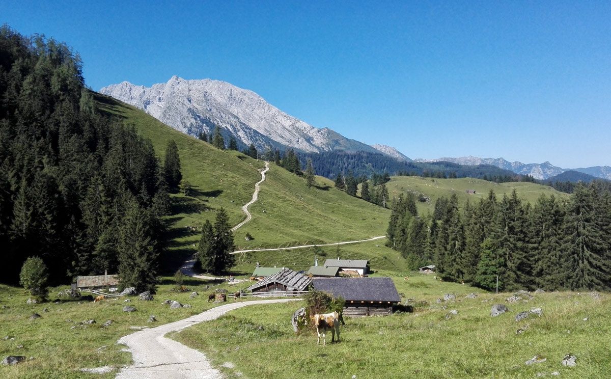 Über das Carl-von-Stahl-Haus am Torrener Joch mit Blick ins österreichische Bluntautal geht es weiter zur Bergstation der Jennerbahn und zur Aussichtsplattform am Jennergipfel. Wer die 1.000 m Höhendifferenz scheut, wählt als Ausgangspunkt den Parkplatz Hinterbrand und quert über den Königsweg vorbei an saftigen Wiesen zur Königsbachalm.