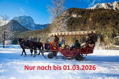 Wer will kann bis zur Wildfütterung auch mit einem Pferdeschlitten fahren. Bis zu 12 Personen passen auf so einen Schlitten. Von der Nationalparkinfostelle Klausbachhaus bis zur Wildfütterung dauert die Fahrt etwa 30 Minuten.
