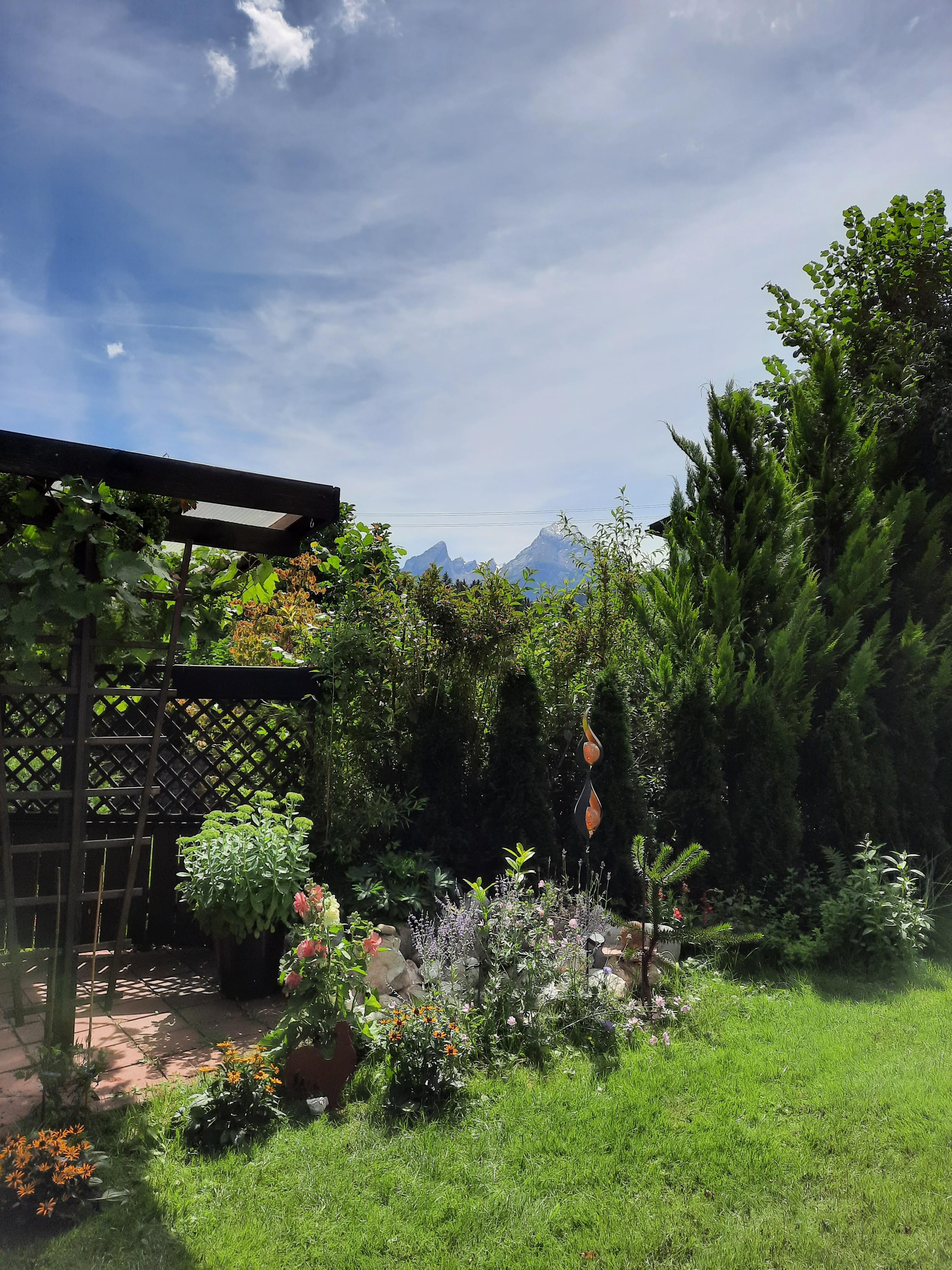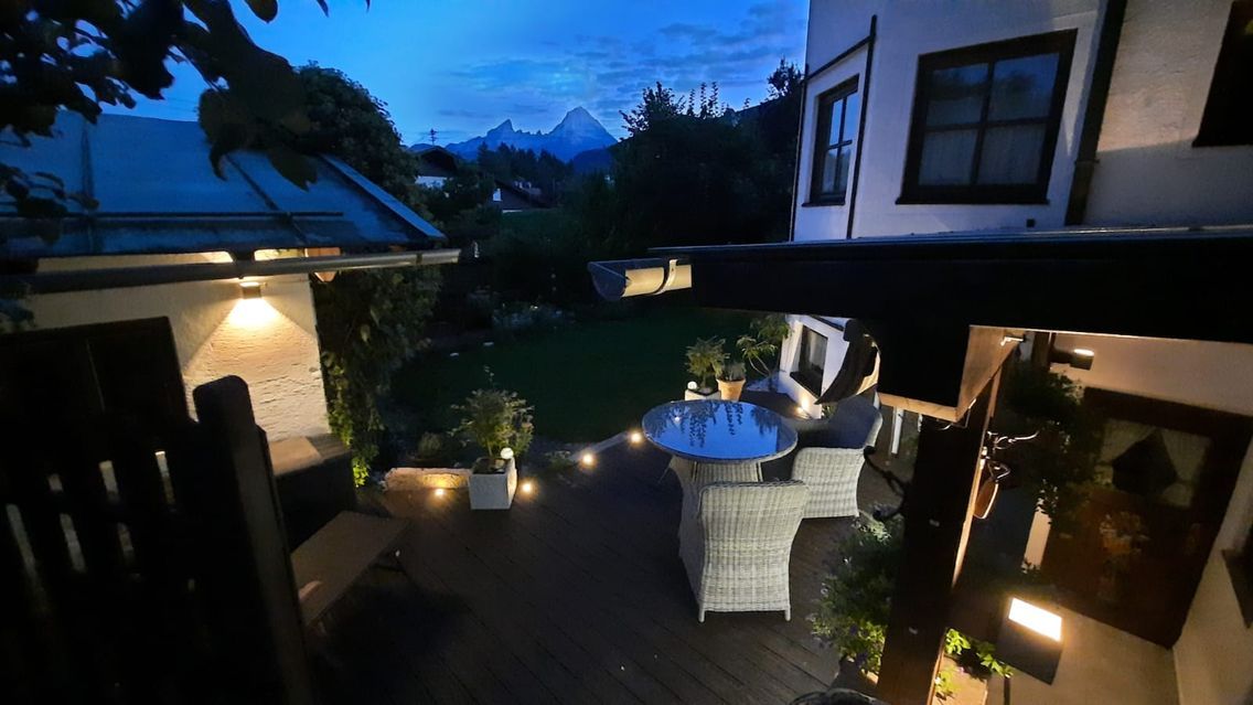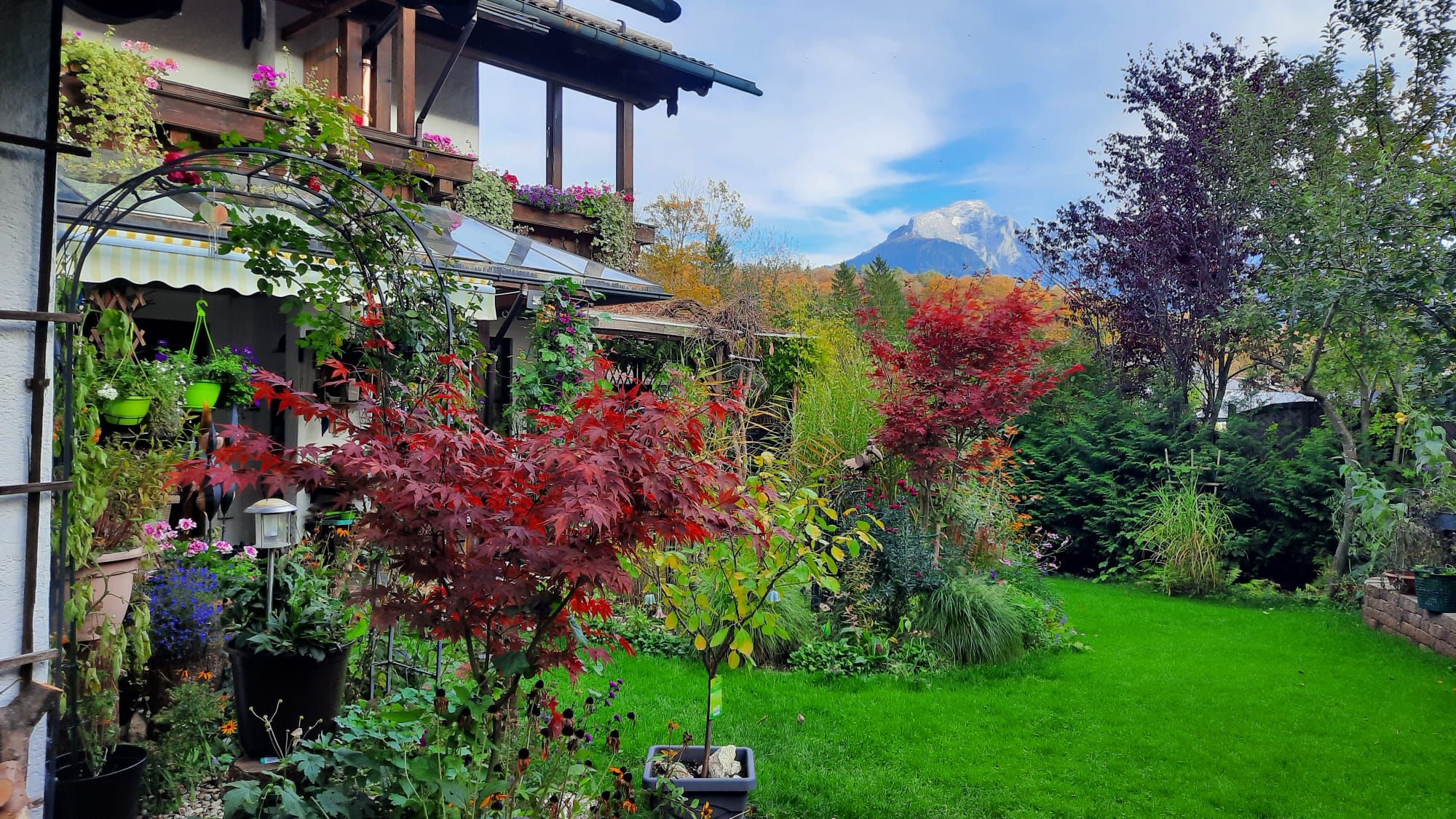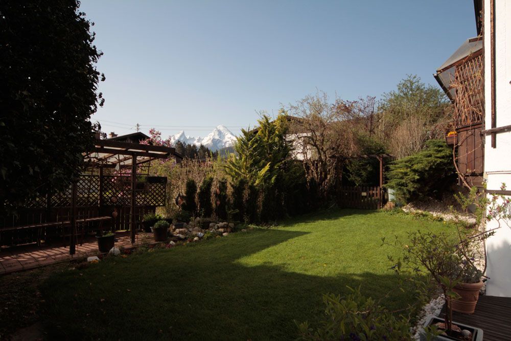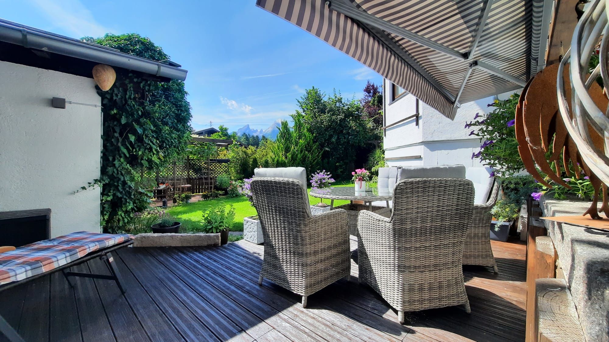 Landhaus mit vielen liebevollen Details und herrlichem Bergblick. Für gemütliche Stunden im Freien steht Ihnen eine große Terrasse mit elektrisch verfahrbaren Sonnenschutz und Gartenmöbeln mit Sitzkissen zur Verfügung. Auf der Liegewiese können Sie auf Gartenliegen den herrlichen Blick auf den Watzmann und die umliegende Bergwelt genießen.Ein Parkplatz befindet sich direkt am Haus (max. 1 Stellplatz). Informationsmaterial für Wanderungen, Berg- und Radtouren liegen aus.