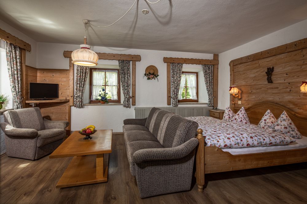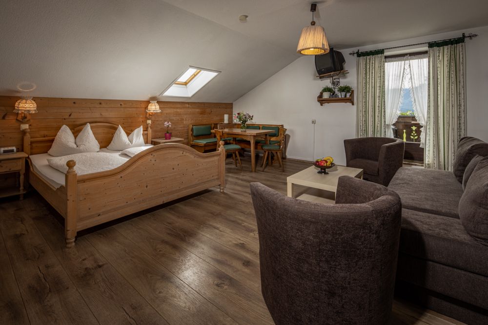 Entdecken Sie den Charme des Graznhofs in Aufham, einem ehemaligen Bauernhof von 1866, mit atemberaubendem Bergblick und einem einladenden Garten.
