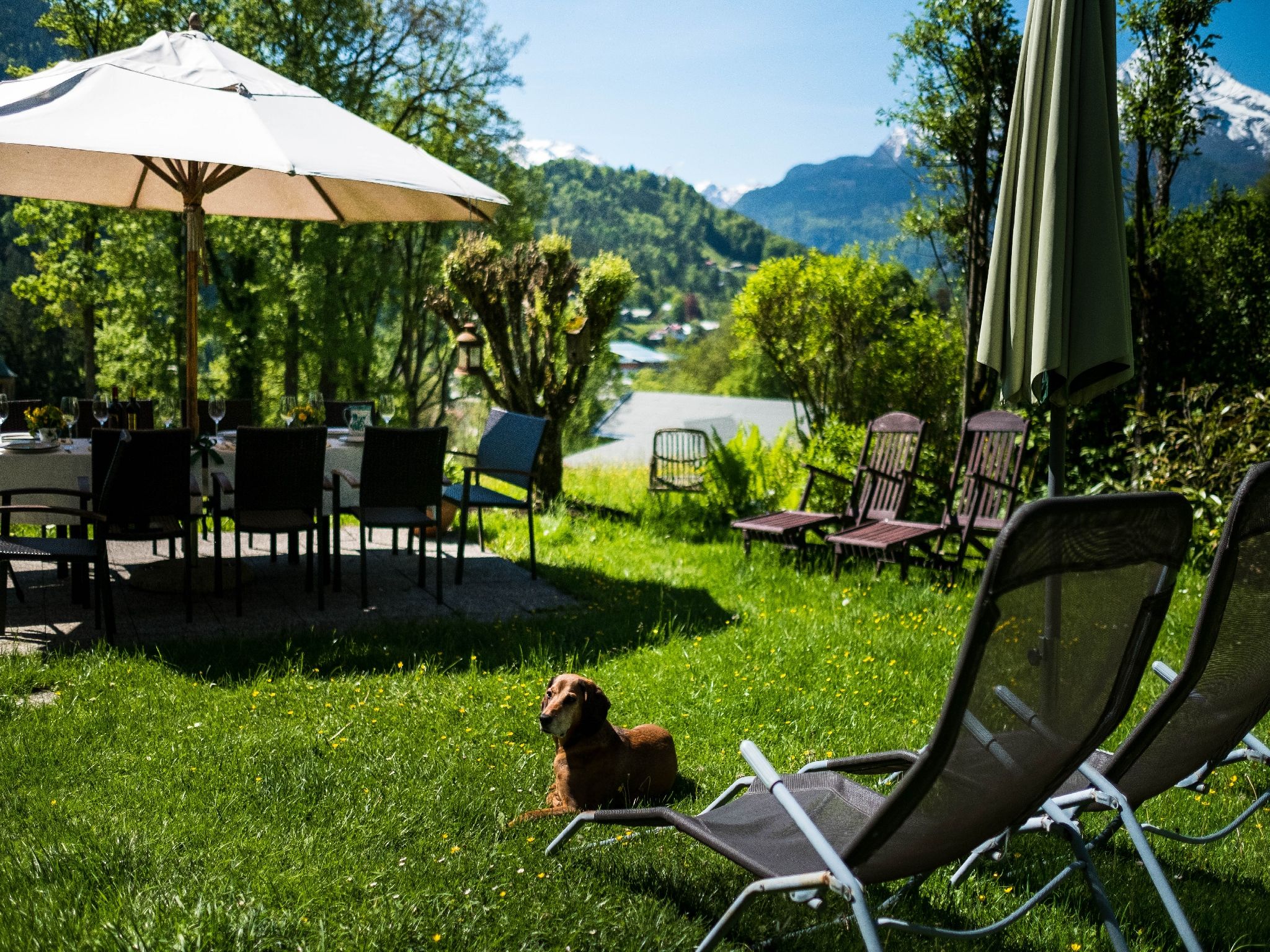 Herzlich Willkommen in der Villa Aldefeld!Wir - das sind Helga und Jörg Rust - bieten unseren Gästen seit vielen Jahren ein Ferienhaus für bis zu acht Personen und eine Ferienwohnung für zwei bis vier Personen. Die Villa Aldefeld liegt in südlicher Hanglage am Ortsrand von Berchtesgaden. Hier gibt es keinen Durchgangsverkehr und die Ruhe unserer Umgebung wird durch keinen Verkehrslärm gestört. Trotzdem sind es zum Ortszentrum Berchtesgadens nur 20 Minuten Fußweg. Alle Gäste können unseren großen Garten und die Terrasse benutzen. Von hier genießen Sie einen Panoramablick auf die Berchtesgadener Alpen mit den Bergen Hoher Göll, Obersalzberg, Jenner und Watzmann. Sie können aber auch in unseren Liegestühlen die Ruhe und Schönheit unseres Bio-Gartens genießen. Ab Spätsommer und Herbst dürfen Sie von unseren Obstbäumen ernten.2019 haben wir neue Apfel-, Kirsch- und Pflaumen-Bäume gepflanzt. Viel Wert legen wir auf unseren Bauerngarten. Hier ernten wir Salate und diverses Gemüse und bieten unseren Gästen auch hiervon Kostproben an. Bedienen Sie sich gerne an den frischen Kräutern aus unserer Kräuter-Schnecke! Für alle Grill-Freunde steht ein Gas-Grill zur Verfügung. Auf Anfragen richten wir Ihnen ein leckeres, reichhaltiges Frühstück her. Sie können aber auch nur unseren Brötchen- und Getränke-Service in Anspruch nehmen. Das W-LAN in Wohnung und Haus steht Ihnen zur kostenfreien Nutzung zur Verfügung. Auf Anfrage dürfen Sie mit Einschränkungen auch Ihre Haustiere mitbringen.