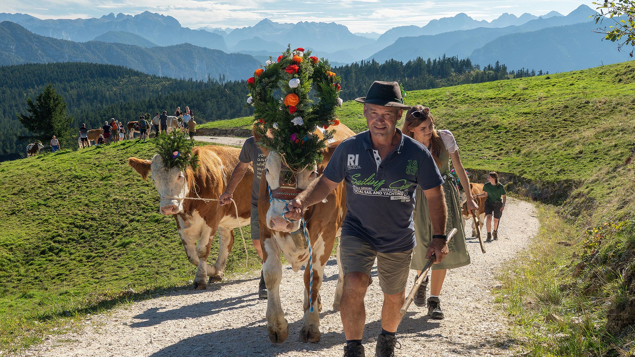 Um 13.00 Uhr die Tiere "aufgekranzt" (geschmückt) und ziehen ab 14.00 Uhr ins Tal und um ca.16.00 Uhr werden sie in Seiberstadt am Wanderparkplatz erwartet. Nach einem hoffentlich unfallfreien Almsommer geht es über die Wintermonate wieder zurück in die Ställe der Teisendorfer Bauern.