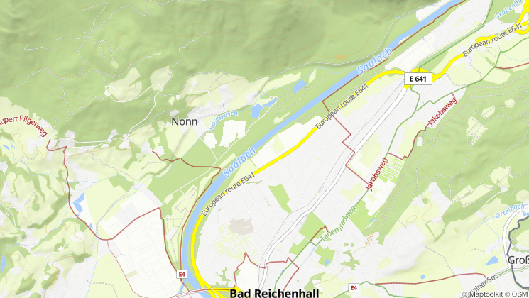 Von Rupertustherme Unterführung am Skatepark vorbei, über den Fuß-Radweg und geradeaus die Rampe zur Saalach runter (Ende der Friedrich-Ebert-Allee)