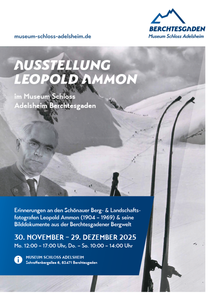 Eine sehenswerte Fotoausstellung im Museum Schloss Adelsheim Erinnerungen an den Schönauer Berg- & Landschaftsfotografen Leopold Ammon (1904 – 1969) & seine Bilddokumente aus der Berchtesgadener Bergwelt. Das Museum Schloss Adelsheim zeigt eine sehenswerte Ausstellung mit rund 50 großformatigen Schwarzweiß-Aufnahmen des Schönauer Bergfotografen Leopold Ammon. Seine historischen Bilder zeigen die Berchtesgadener Bergwelt in eindrucksvoller Klarheit – vom Watzmann bis zum Steinernen Meer – und dokumentieren eindrücklich, wie sich Landschaft und Bebauung im Laufe der Jahrzehnte verändert haben. Ammons Fotografien, einst als Ansichtskarten weltweit verbreitet, zeugen von seinem alpinen Können und der Mühe, mit damaliger Ausrüstung in schwierigem Gelände zu arbeiten. Die Ausstellung ist zugleich ein Beitrag zum 150-jährigen Jubiläum der DAV-Sektion Berchtesgaden – von einem Mitglied zu Ehren eines früheren Mitglieds, Pioniers und Bildbotschafter des Berchtesgadener Landes. Ein Besuch lohnt sich! Eintrittspreise: Sonderausstellung 3 Euro, in Kombination mit dem Museums-Besuch 8 Euro