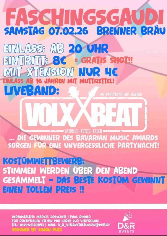Faschingsgaudi im Brennerbräu mit "Volxxbeat", der Partyband aus Bayern. Kostümwettbewerb: Stimmen werden über den Abend gesammelt - das beste Kostüm gewinnt einen tolle Preis. Einlass ab 16 Jahren mit Muttizettel Eintritt 8 € = Partyshot - mit XTENSION nur 4 €