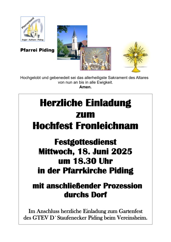 Festlicher Fronleichnamsgottesdienst am Mittwoch, 03.06.2026 um 18.30 Uhr in der Pfarrkirche Piding mit anschl. Prozession durchs Dorf. Musikalisch begleitet wird die Prozession in bewährter Weise von der Musikkapelle Piding. 4 Altäre (Petersplatz, Pfarrhaus/Thomastr./ Lena-Christ-Str., Parkplatz Altwirt), als Abschluss gemeinsamer Einzug der Prozessionsgemeinde in die Pfarrkirche, Einsetzung des Allerheiligsten, Te Deum (Großer Gott wir loben dich …).