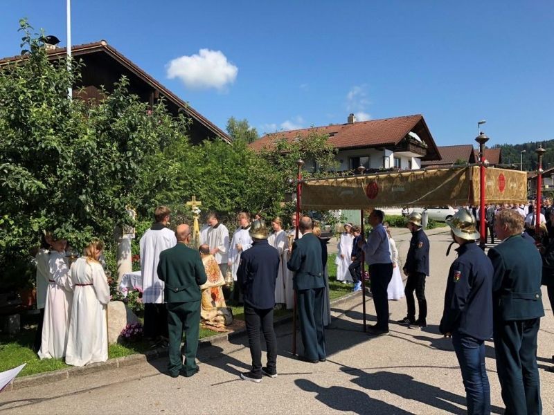4 Altäre (Petersplatz, Pfarrhaus/Thomastr./ Lena-Christ-Str., Parkplatz Altwirt), als Abschluss gemeinsamer Einzug der Prozessionsgemeinde in die Pfarrkirche, Einsetzung des Allerheiligsten, Te Deum (Großer Gott wir loben dich …).