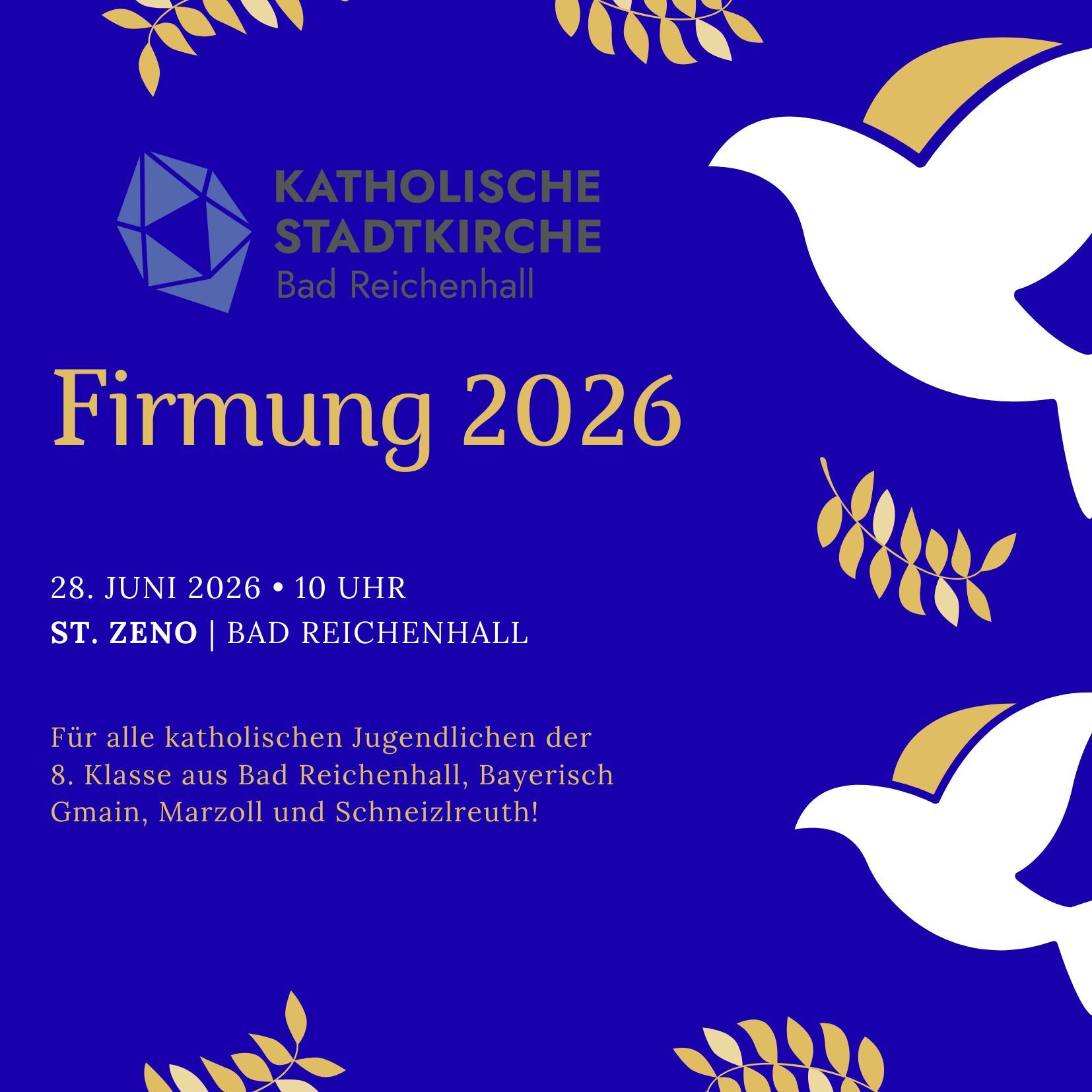 Pfarrkirchenstiftung St. ZenoFirmung 2026Für alle katholischen Jugendlichen der 8. Klasse aus Bad Reichenhall, Bayerisch Gmain, Marzoll und Schneizlreuth!
