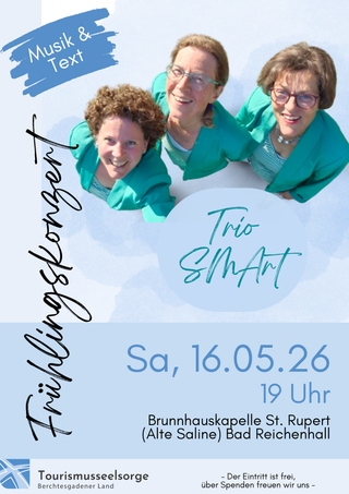 Frühlingskonzert mit dem Trio SMArt Samstag 16.05.2026, 19 Uhr, Brunnhauskapelle St. Rupert Bad Reichenhall (Alte Saline) Das Trio SMArt präsentiert Vokalmusik von zarter Schönheit und rhythmischen Klängen. SMArt steht dabei nicht nur für die drei Frauenstimmen Sopran, Mezzosopran und Alt, sondern auch für die drei smarten Damen Ruth Stoffel, Anette Peters und Renate Graßl aus Bad Reichenhall. Ihr Repertoire umfasst geistliche und weltliche Musik von der Renaissance bis in unsere Gegenwart. Im Wechsel mit der Musik liest Diakon Johann Schmidt abendliche Texte. Freuen Sie sich auf ein abwechslungsreiches Konzerterlebnis!