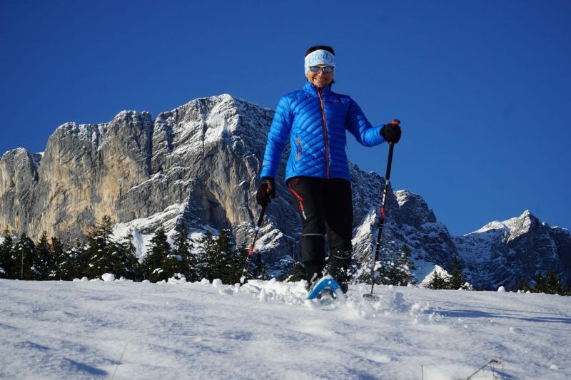 Die Schneeschuhtouren können mit normaler Fitness gut gegangen werden. Schneeschuhe und Stöcke stehen zur Verfügung.