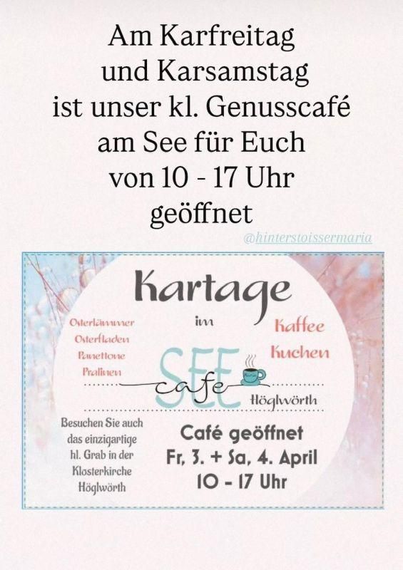 Am Karfreitag und Karsamstag ist unser kleines Genusscafé am See für Euch geöffnet. Wir verwöhnen Sie mit Kaffee und Kuchen, Osterlämmer, Osterfladen, Panettone und Pralinen.