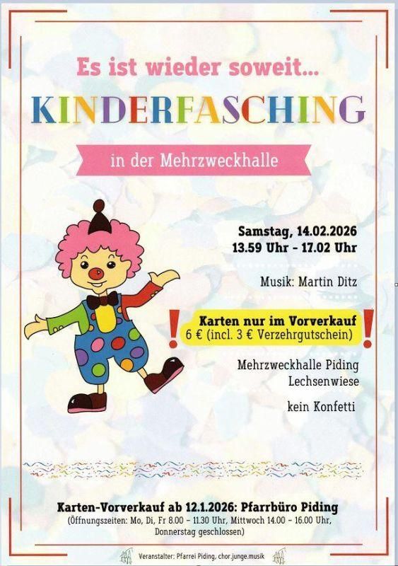 Kinderfasching in der Mehrzweckhalle Piding, am Sonntag, 14.02.2026 von 13:59 Uhr bis 17:02 Uhr.
