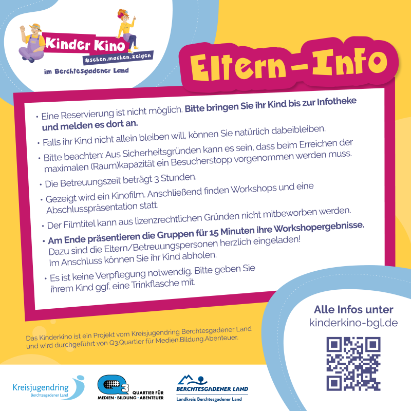 Die Betreuungszeit beträgt 3 Stunden, 15 Minuten vor Ende präsentieren die Gruppen ihre Workshop Ergebnisse. Dazu sind die Eltern/ Betreuungspersonen herzlich eingeladen! Falls Ihr Kind nicht alleine bleiben will, können Sie natürlich dabeibleiben.