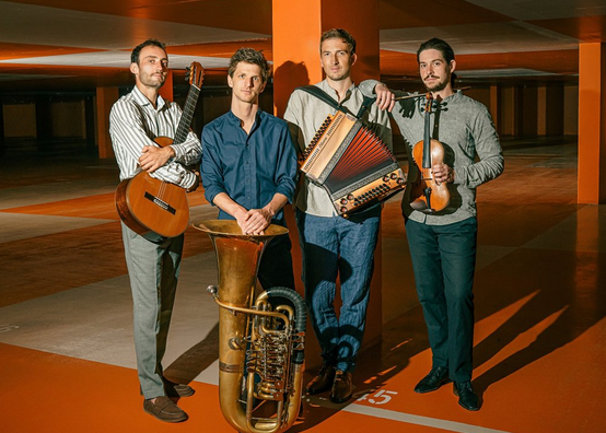 Steirische Harmonika, Geige, Gitarre und Tuba – Die vier virtuosen Musiker von MAXJOSEPH weben ein dynamisch und kammermusikalisch höchst feines Geflecht, und zwar in einer derartigen Eleganz und Leichtigkeit, die man im Zusammenhang mit Volksmusik so nicht erwartet hätte.