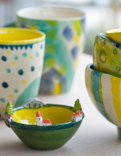 Beim ersten Termin wird der Ton geformt; beim zweiten Treffen wird (bunt) glasiert. Das abschließende Brennen übernehmen die Hohenfrieder Werkstätten.
