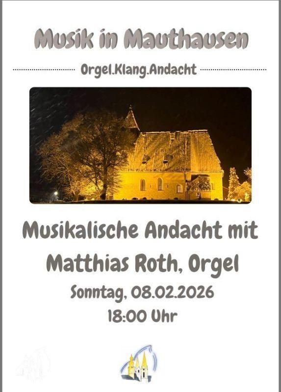 MUSIK IN MAUTHAUSEN - Sonntag, 08.02.2026 um 18.00 Uhr Kirche in Mauthausen „St. Laurentius“ Musikalische Andacht mit Matthias Roth, Orgel Nähere Informationen erhalten Sie auf der Website des Pfarrverbandes Anger-Aufham-Piding. http://www.pv-aap.de