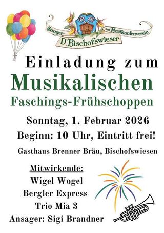 Musikalischen Faschings- Frühschoppen im Gasthaus Brennerbräu. Mitwirkende: Wigel Wogel Bergler Express Trio Mia 3 Ansager: Sigi Brandner