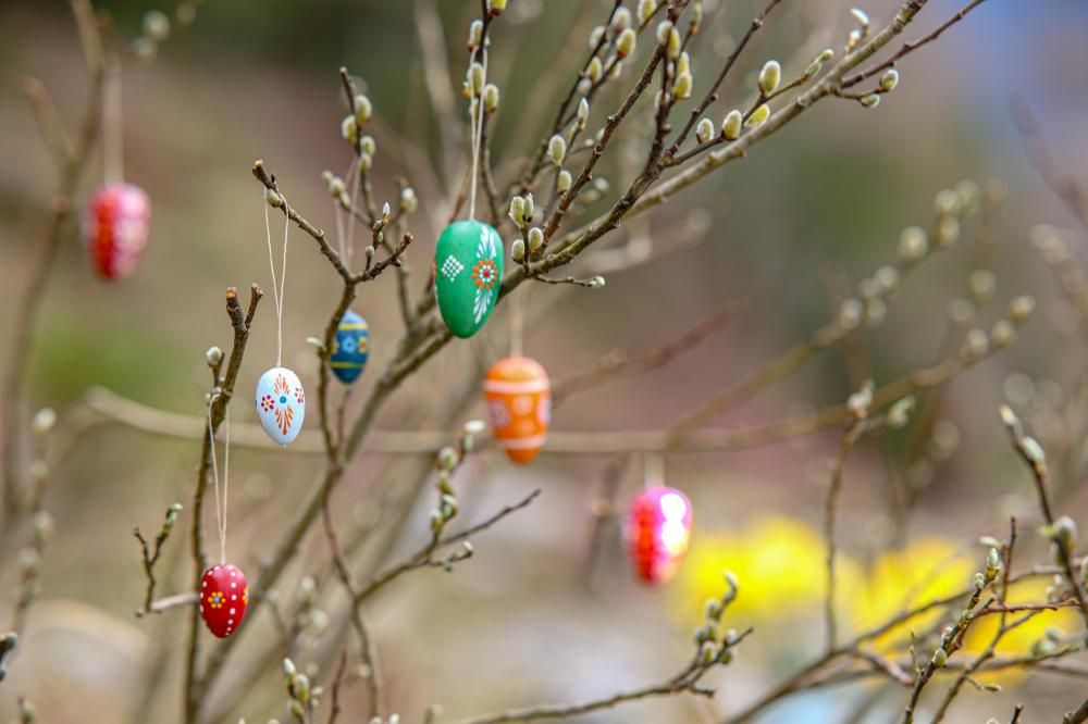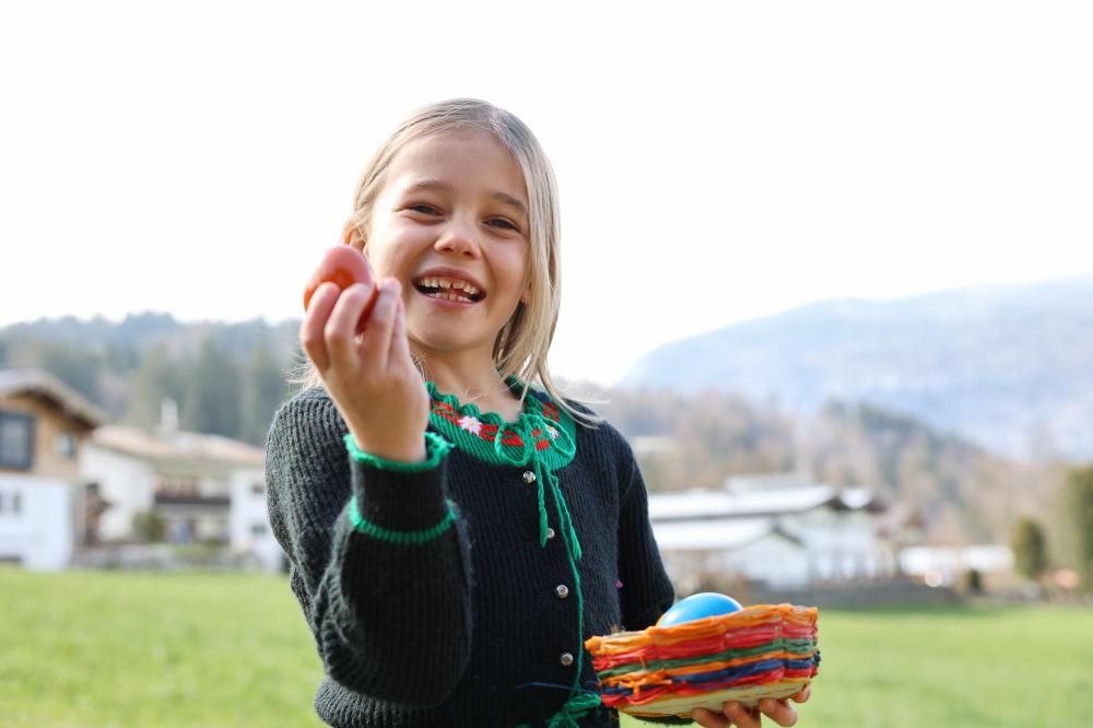 5 kleine Osterholzeier der Berchtesgadener Handwerkskunst werden im Garten des Museums versteckt.