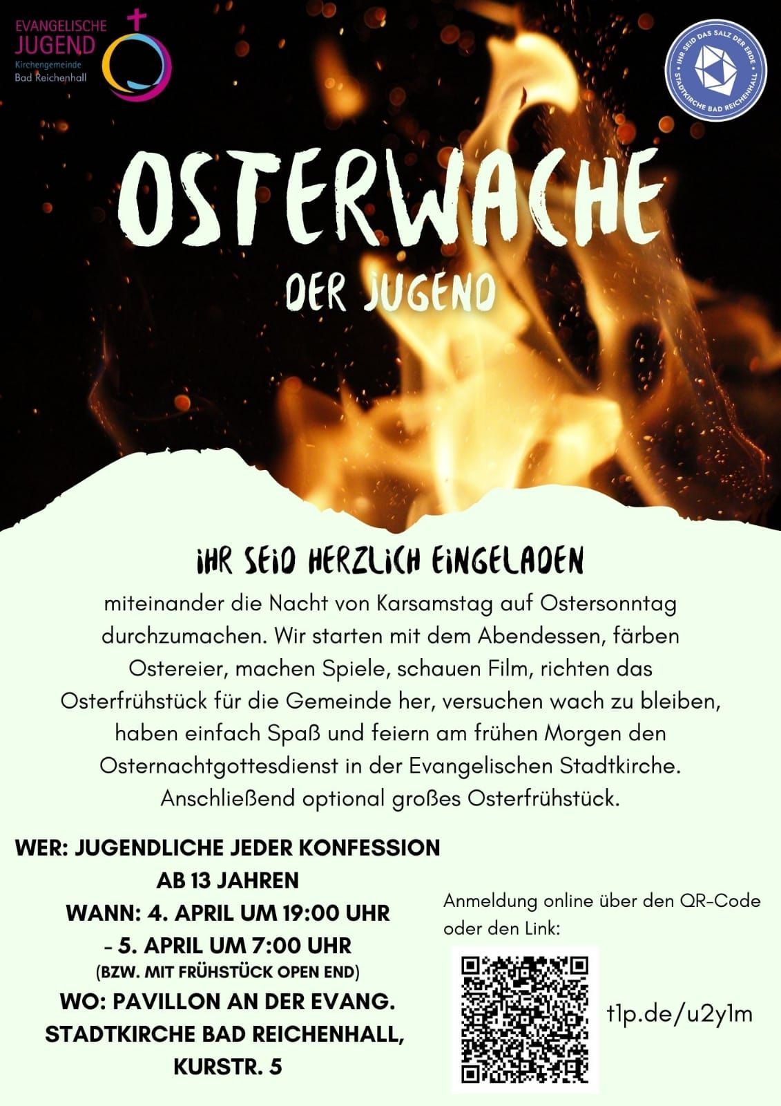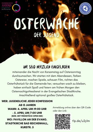 Osterwache der Jugend, Ihr seid herzlich eingeladen miteinander die Nacht von Karsamstag auf Ostersonntag durchzumachen. Wir starten mit dem Abendessen, färben Ostereier, machen Spiele, schauen Filme, richten das Osterfrühstück für dieGemeinde her, versuchen wach zu bleiben, haben einfach Spaß und feiern am frühen Morgen den Osternachtgottesdienst in der Evangelischen Stadtkirche. Anschließend optional großes Osterfrühstück. Wer: Jugendliche jeder Konfession ab 13 Jahren.