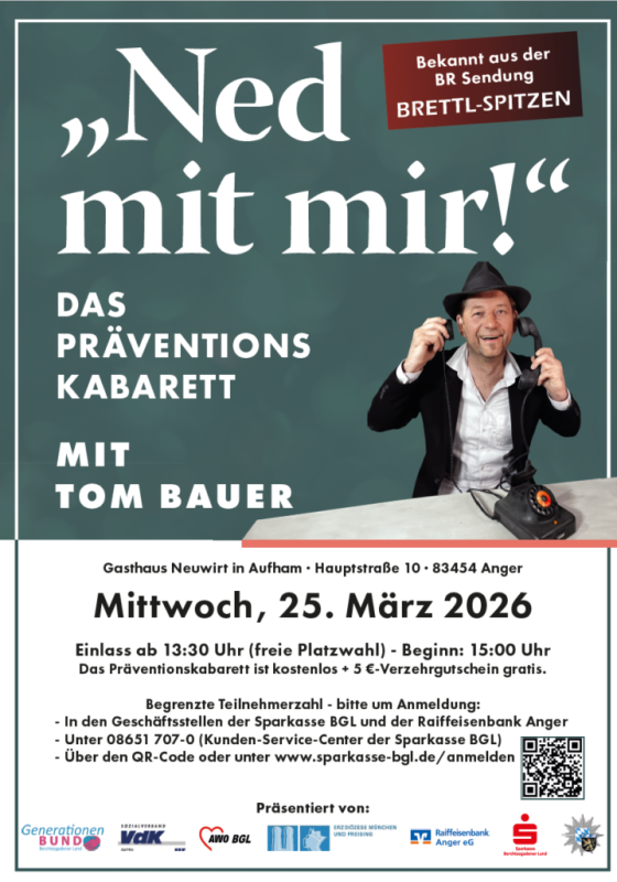 Das Präventionskabarett "Ned mit mir!" mit Tom Bauer kommt nach Aufham! Einlass ab 13:30 Uhr (freie Platzwahl) - Beginn: 15:00 Uhr Das Präventionskabarett ist kostenlos. Begrenzte Teilnehmerzahl - bitte um Anmeldung: - In den Geschäftsstellen der Sparkasse BGL und der Raiffeisenbank Anger - Unter 08651 707-0 (Kunden-Service-Center der Sparkasse BGL) Weitere Infos und Anmeldemöglichkeiten siehe auch angefügtes Plakat