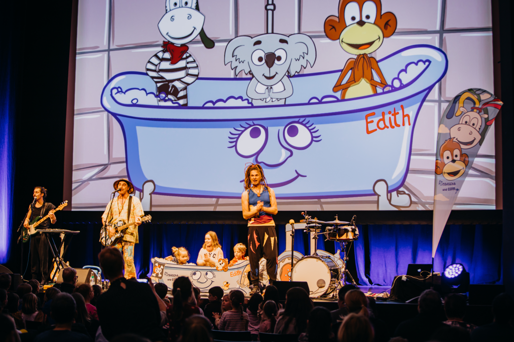 präsentieren ein einzigartiges Konzerterlebnis für die ganze Familie. Bekannte Szenen aus ihren Animationsfilmen werden live begleitet von mitreißenden Mitmachhits. Rodscha und Toms tierische Freunde, Artis, Ze-Ra und Karri, lebensgroße Figuren, besuchen die Bühne für Tanzeinlagen.