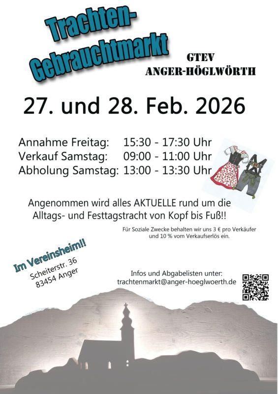 Bei unserem alljährlichen Trachten-Gebrauchtmarkt gibt es alles rund um die Alltags- und Festtagstracht. Im Vereinsheim des GTEV Anger-Höglwörth (Scheiterstr. 36, 83454 Anger) finden Sie gut erhaltene, gebrauchte Trachtenartikel zu fairen Preisen.