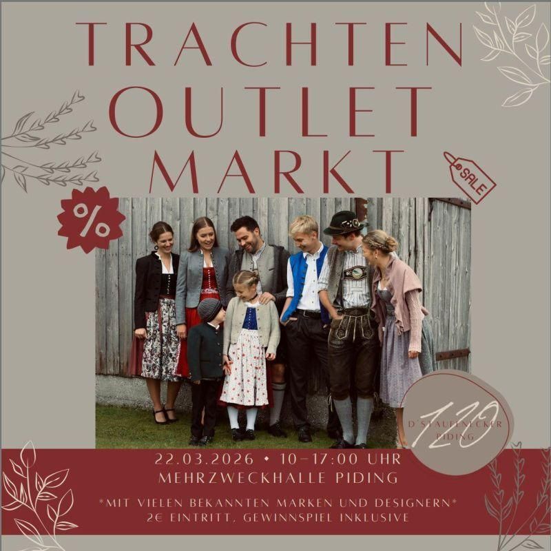 Am Sonntag, 22.03.2026 findet von 10:00 - 17:00 Uhr ein großer Trachten-Outlet-Markt in der Mehrzweckhalle in Piding statt.