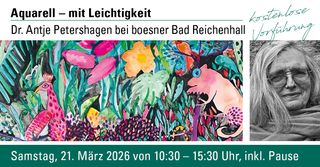 Die Künstlerin Dr. Antje Petershagen führt vor, wie der Einstieg in die faszinierende Technik der Aquarellmalerei spielerisch leicht gelingt. Kostenlos, ohne Anmeldung.