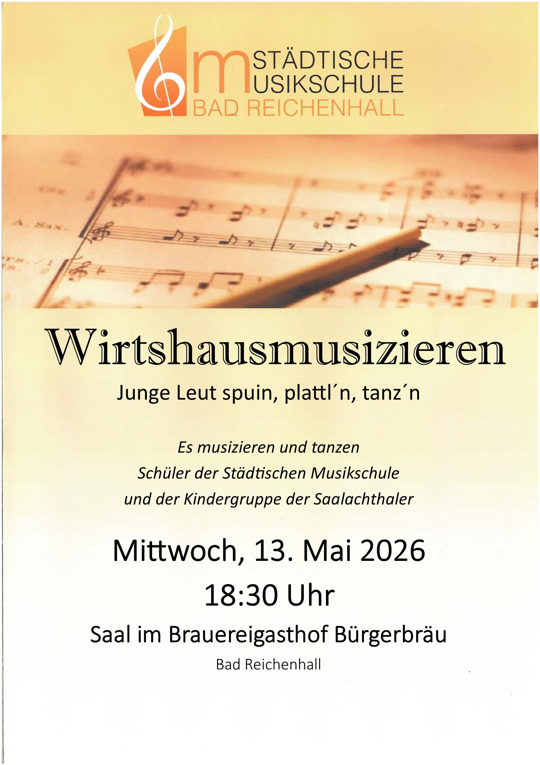 Es musizieren und tanzen Schüler der Städtischen Musikschule Bad Reichenhall und der Kindergruppe der "Saalachthaler". Wir sind zu Gast im Gasthof Bürgerbräu.