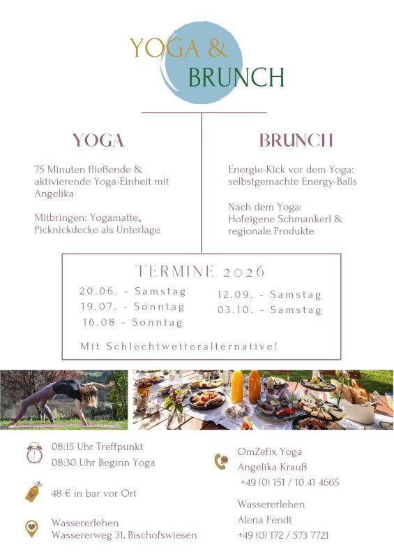 Yoga Flow Angelika startet mit einer 75 minütigen, fließenden und aktivierenden Yoga-Einheit. Finde deine körperliche und innere Mitte durch eine bewusste Ausrichtung von Körper, Geist & Atmung Biosphären-Brunch Regional & Saisonal Lass dich im Anschluss mit regionalen und hofeigenen Köstlichkeiten verwöhnen Infos: Treffpunkt: 08:15 Uhr Start Yoga: 08:30 Uhr 75 Minuten Yoga Mitbringen: Matte, Decke, Picknickdecke Bei schönem Wetter findet die Yoga – Einheit, sowie der anschließende Brunch auf der Panoramaterrasse & Garten, bei schlechter Witterung im Yoga-Raum und der gemütlichen Stube statt. Ansprechpersonen: Omzefix Yoga: Angelika Kraus 0151 104 14665 Wassererlehen: Alena Fendt 0172 573 7721 Kosten: 48,00 Euro pro Person – die Bezahlung erfolgt vor Ort und in Bar. Minimale Teilnehmeranzahl: 4 Personen Maximale Teilnehmeranzahl: 12 Personen