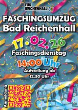 Am Faschingsdienstag, den 17.02.2026, findet wieder der große Faschingsumzug durch die Innenstadt von Bad Reichenhall statt.